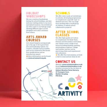 Artivity is a children’s art school in Peterborough, Cambridgeshire. We wanted to collaborate with experts to ensure the look was just right. Our youngest rhinos, aged 8 and 4, helped cut the paper shapes for this brand, making it especially close to our hearts. We designed a map, a flyer and a range of beautiful patterns, allowing Artivity to quickly apply the brand across their promotional materials, website, and signage.